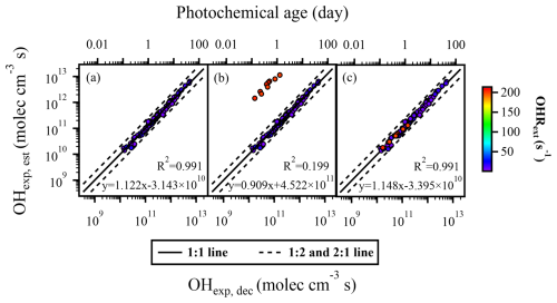 The oxidation flow reactor (OFR) has been widely used to simulate secondary organic aerosol (SOA) formation in laboratory and field studies. OH exposure (OHexp), representing the extent of hydroxyl (OH) radical oxidation and normally expressed as the product of OH concentration and residence time in the OFR, is important in assessing the oxidation chemistry in SOA formation. Several models have been developed to quantify the OHexp in OFRs, and empirical equations have been proposed to parameterize OHexp. Practically, the empirical equations and the associated parameters are derived under atmospheric relevant conditions (i.e., external OH reactivity) with limited variations in calibration conditions, such as residence time, water vapor mixing ratio, and ozone (O3) concentration. Whether the equations or parameters derived under limited sets of calibration conditions can accurately predict the OHexp under dynamically changing experimental conditions with large variations (i.e., extremely high external OH reactivity) in real applications remains uncertain. In this study, we conducted 62 sets of experiments (416 data points) under a wide range of experimental conditions to evaluate the scope of the application of the empirical equations to estimate OHexp. Sensitivity tests were also conducted to obtain a minimum number of data points, which is necessary for generating the fitting parameters. We showed that, for the OFR185 mode (185 nm lamps with internal O3 generation), except for external OH reactivity, the parameters obtained within a narrow range of calibration conditions can be extended to estimate the OHexp when the experiments are in wider ranges of conditions. For example, parameters derived within a narrow water vapor mixing ratio range (0.49 %–0.99 %, corresponding to 15.1 %–30.8 % of relative humidity at 101.325 kPa and 298 K) can be extended to estimate the OHexp under the entire range of water vapor mixing ratios (0.49 %–2.76 %, equivalent to 15.1 %–85.7 % of relative humidity under identical conditions). However, the parameters obtained when the external OH reactivity is below 23 s−1 could not be used to reproduce the OHexp under the entire range of external OH reactivity (4–204 s−1). For the OFR254 mode (254 nm lamps with external O3 generation), all parameters obtained within a narrow range of conditions can be used to estimate OHexp accurately when experimental conditions are extended. Additionally, when using the OFR254 mode, lamp voltages that are too low should be avoided, as they will generally result in large deviations in the estimations of OHexp from empirical equations. Regardless of whether the OFR185 or OFR254 mode is used, at least 20–30 data points from sulfur dioxide (SO2) or carbon monoxide (CO) decay with varying conditions are required to fit a set of empirical parameters that can accurately estimate OHexp. Caution should be exercised to use fitted parameters from low external OH reactivity to high ones, for instance, those from direct emissions such as vehicular exhaust and biomass burning.