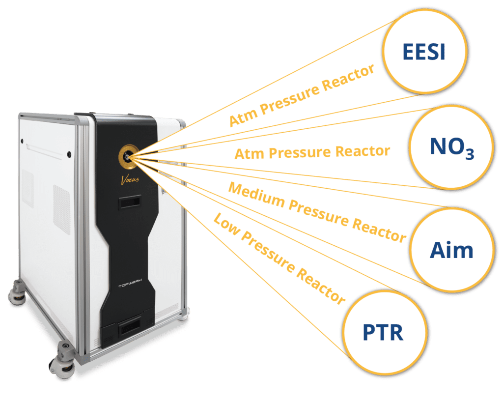 Reagent ion switching enables real-time monitoring using different reagent ions with a single reactor. Switching timescales are 50-100 ms for the Aim Reactor, as as fast as 10 s for the PTR Reactor.